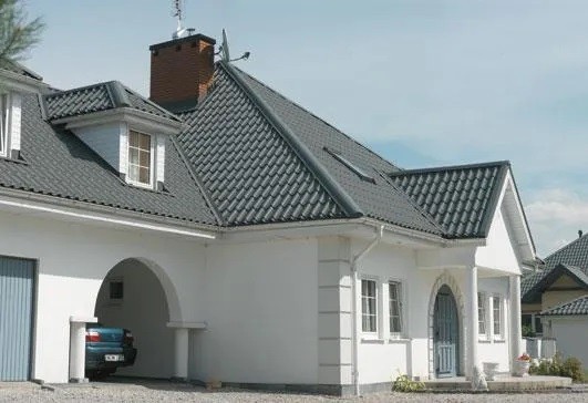 Металлочерепица Ruukki Elite Pur Matt изготавливается методом горячего оцинкования. За основу берутся стальные листы стандартной толщины 0,5 мм, которые в процессе специальной обработки приобретают дополнительную прочность и жесткость. Это делает их стойкими к воздействию большинства негативных факторов среды, включая осадки, солнечные лучи, ветровые нагрузки. Матовое полимерное покрытие создает красивый эффект на поверхности, визуально подчеркивает эстетику кровли. Толщина защитного слоя составляет 50 мкр, этого достаточно, чтобы защитить профили от царапин и механических повреждений. К неоспоримым преимуществам серии относится то, что металлочерепица Ruukki Elite Pur Matt имеет гарантированный производителем срок эксплуатации, достигающий 25 лет.