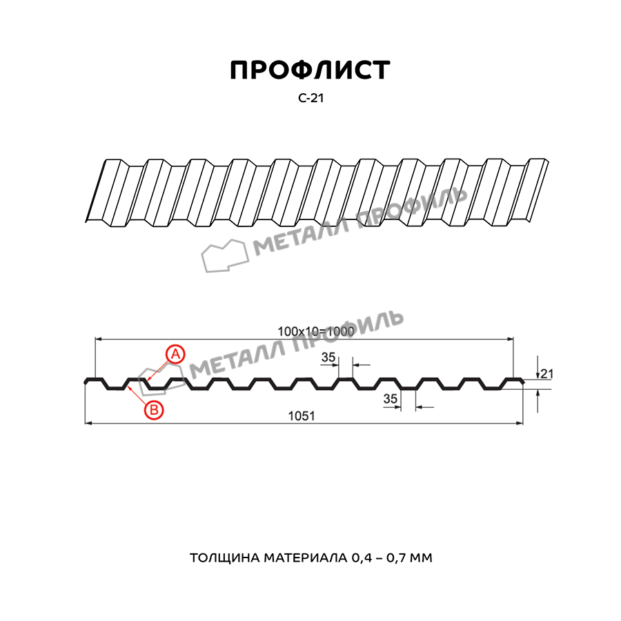 Профиль С-21 имеет толщину 0,5 мм, что обеспечивает прочность и долговечность конструкции. Он изготовлен из металла, что делает его устойчивым к воздействию внешних факторов, таких как коррозия и погодные условия.