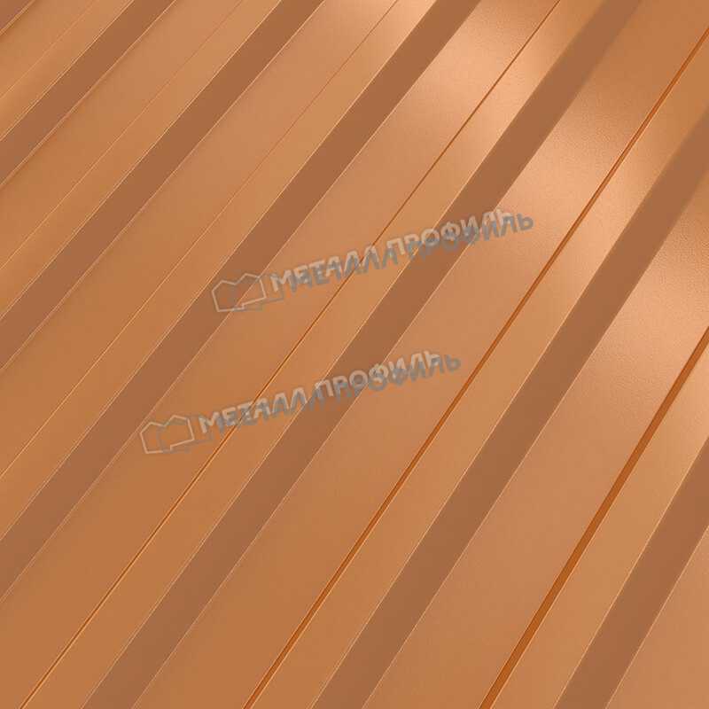 Профлист изготовлен из металла толщиной 0,5 мм, что обеспечивает ему высокую прочность и долговечность. Он имеет медный цвет, который придает ему элегантный и стильный вид.